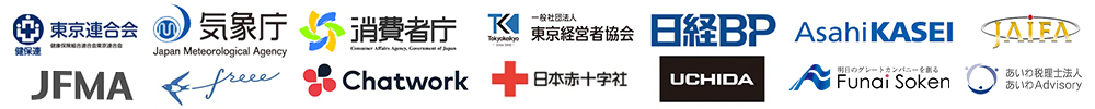 官公庁・消費者庁/気象庁/警視庁/経団連事業サービス/東京経営者協会/日本経済社/日経BP社/ 日本赤十字社/freee株式会社/Chatwork株式会社/株式会社リクルート/大和ハウス工業株式会社/株式会社内田洋行/株式会社 船井総合研究所/ソフトバンク株式会社/あいおいニッセイ同和損害保険株式会社/株式会社日本経営/ メディキャスト株式会社/Panasonic /ヒビノアークス株式会社/ AIG損害保険株式会社/第一法規株式会社/株式会社幻冬社/朝日新聞社/株式会社オークファン/株式会社イノベーション/株式会社オールアバウトライフワークス//富士屋ホテル株式会社/一般社団法人ライフマネジメント/日本赤十字社/主婦の友社/